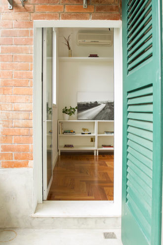 Nas salas individuais as esquadrias são compostas por uma parte fixa e uma porta de abrir. Já na sala de reunião optou-se pelo sistema de abertura tipo “camarão”. Nesse caso a esquadria é composta por 4 folhas que abrem totalmente possibilitando um vão 100% aberto e integrado à sala principal. Para destacar a transição de uso sem abrir mão da integração espacial total, foi pensada uma transição na materialidade do piso; em todo apartamento foi usado um piso em tacão peroba do campo, e na sala de reunião um piso tipo “cemment design” cor cinza.